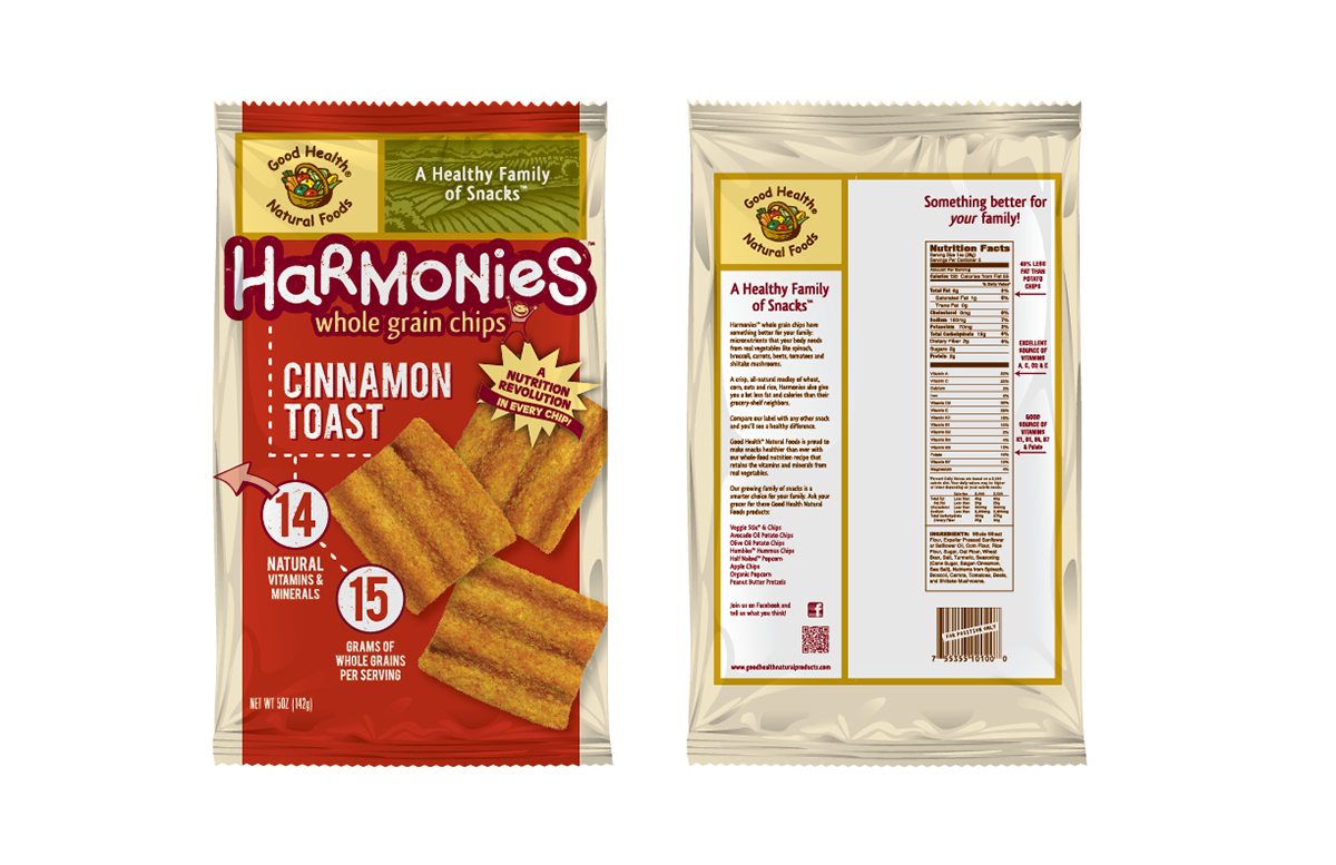 Packaging and logo (Harmonies) for a healthy snack food company.